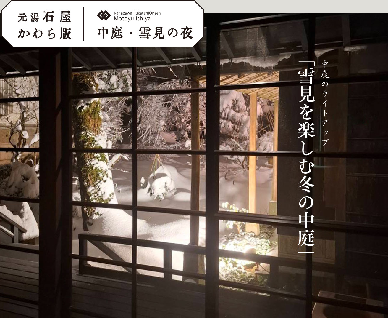 元湯石屋の「中庭」は夜になると『ライトアップ』され、特に雪が降った日には格別の美しさをご覧いただけます。