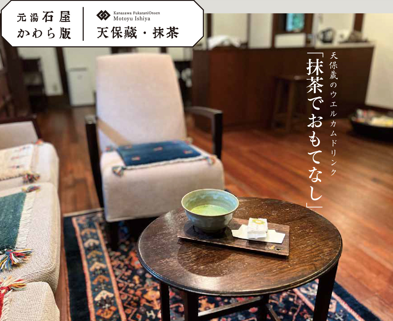 元湯石屋の最高級客室「天保蔵」では、お泊まりのお客様に旅の疲れを癒す一服として『抹茶』をウエルカムドリンクとしてお出ししております。