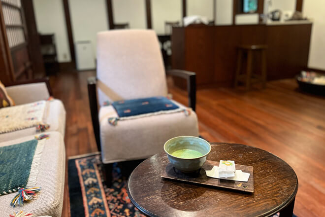 天保元年(1830)につくられた白漆喰の土蔵を、上下階に別れたメゾネットタイプの洋室にしたお部屋です。ヨーロッパから取り寄せた椅子やテーブル、イランのギャッベの絨毯などアンティークな調度品がそろうレトロな空間で、ノスタルジックな時間をお過ごしください。また、天保蔵ではおもてなしのウエルカムドリンクに抹茶をご用意しております。